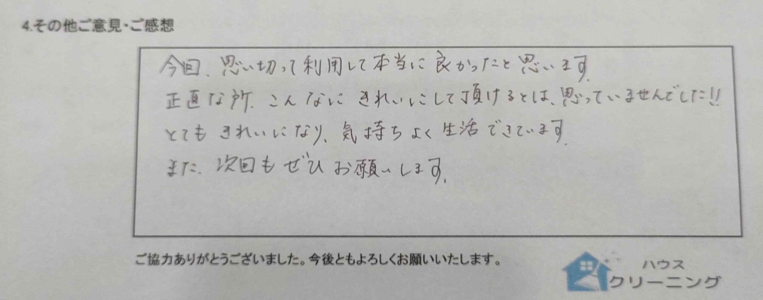 今回、思い切って利用して本当に良かったと思います。正直な所、こんなに、きれいにして頂けるとは、思っていませんでした!!とてもきれいになり、気持ちよく生活できています。また、次回もぜひお願いします。